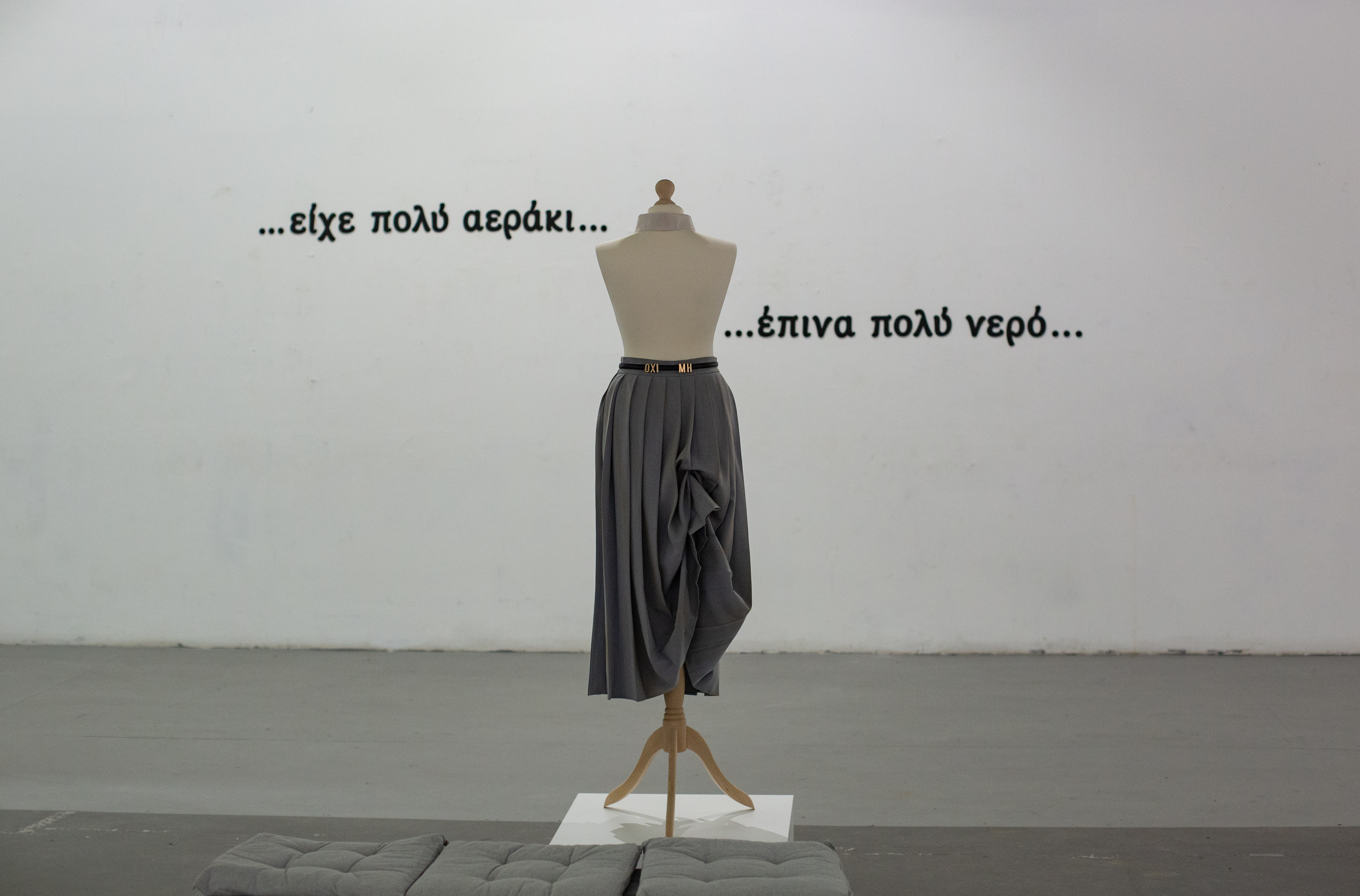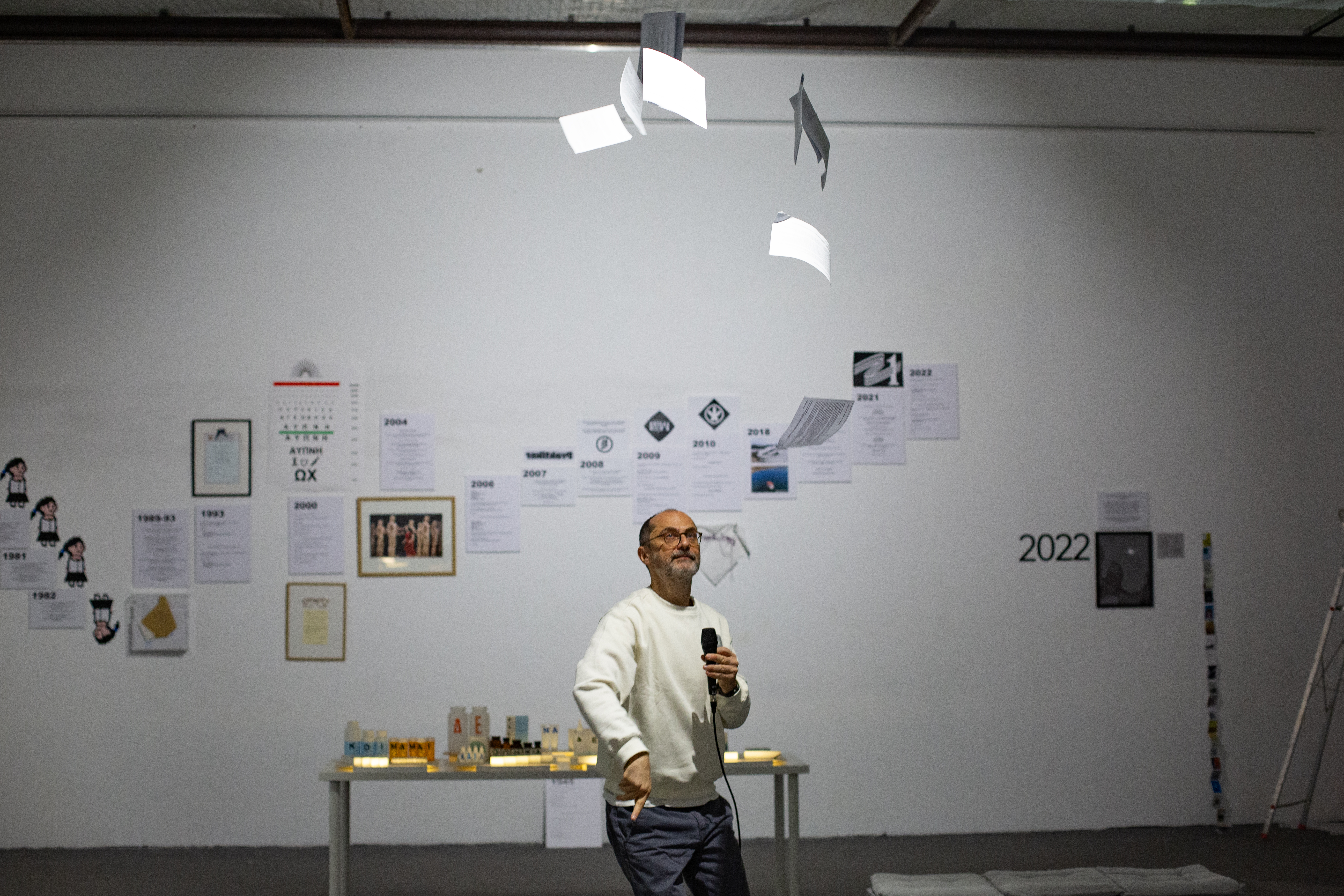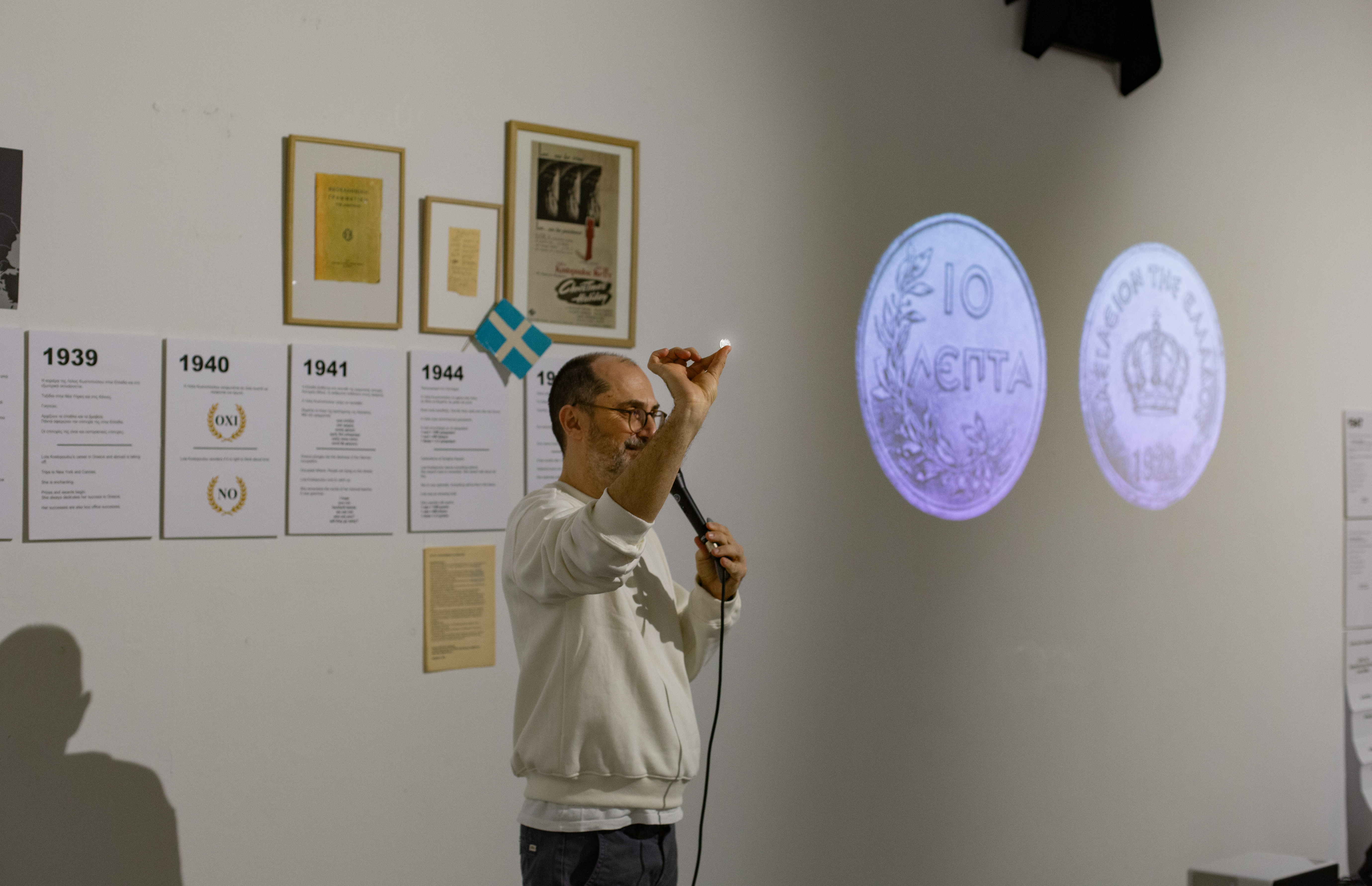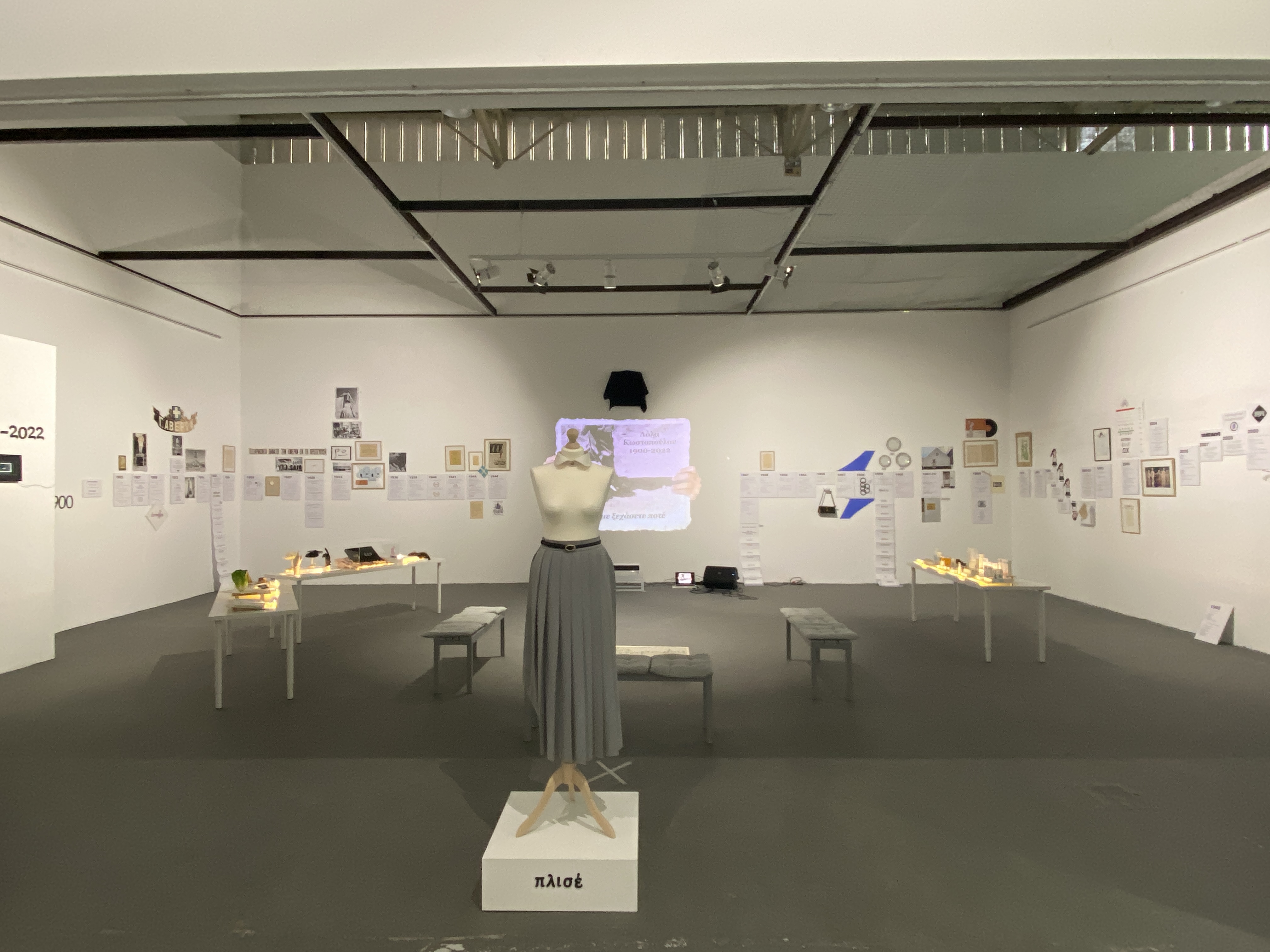 It is a presentation of a memorial exhibition for an important fictional character, of a constructed identity – Lola Kostopoulou. The presentation is framed by an archive, a fake material reality as well. The exhibition guide is also a constructed role of the curator-narrator. Materials that could not otherwise come together are found in the space. The presentation is constantly repeated and this aspires to reveal the condition of its construction.